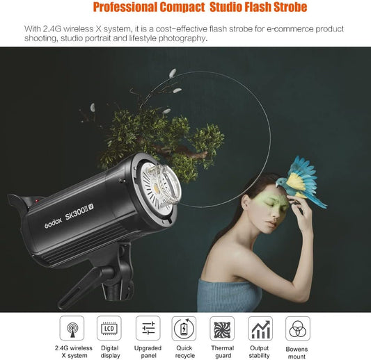 Godox SK300II-V Upgraded Studio Flash Light 300Ws Power GN58 5600±200K Strobe Light with LED Modeling Lamp Bowens Mount Photography Flashes for Advertising Photography