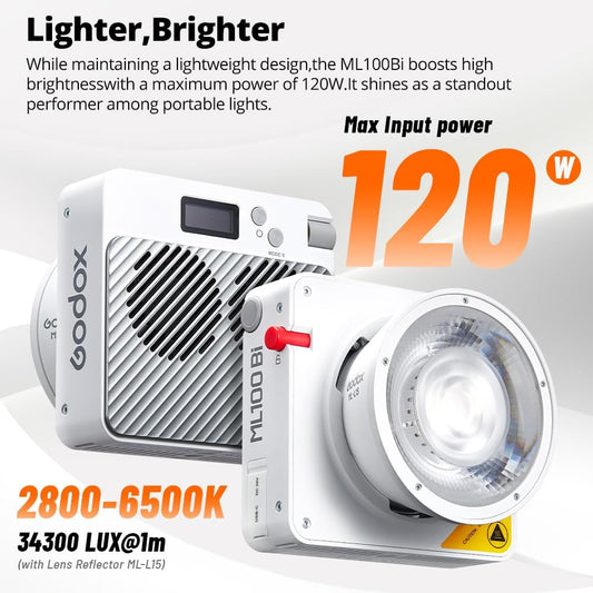 Godox ML100Bi 120W LED Video Light, 2800K-6500K Bi-Color Video Lighting Kit, 34300 Lux CRI 97+/TLCI 98+, APP Control, USB-C Charging, 11 FX Effects, for Filming/Live Streaming/Outdoor Photography
