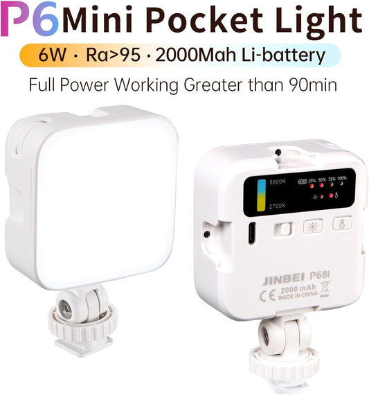 JINBEI P6 Bi-Color Mini Video Light LED Camera Light 2700K-7500K with 4 Cold Shoe Mount CRI 95+ 2000mAh Rechargeable Portable Photography Lighting for Vlog Live Streaming (White)