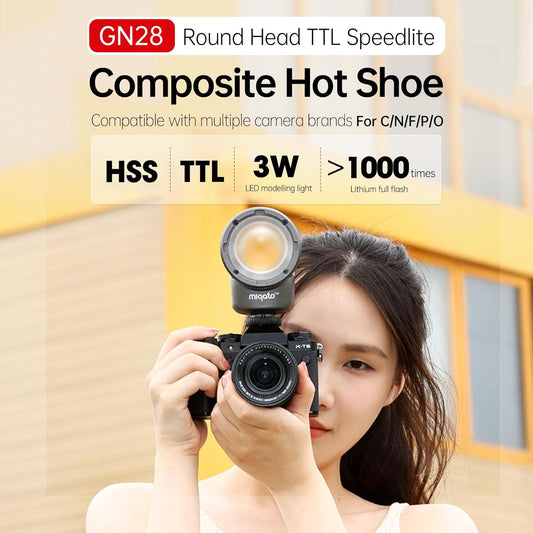 2-in-1 LED Video Light Flash Speedlite GN28 Round Head Rechargeable 2000mAh Battery HSS/TTL Support 3W Modeling Light Bi-Color Temperature 2700K6500K, CRI >95