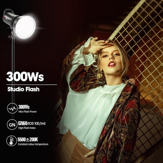 DMII-3 300W Studio Flash 5500K±200K 2.4G Wireless Strobe Flash Light Monlight with 15W LED Modeling Light,Bowens Mount,0.1~1.8S Recycle Time Easycap Mode,for Studio Portrait Commerce Photography