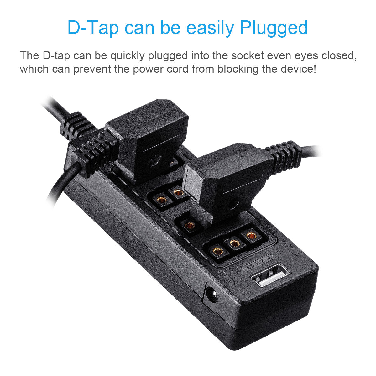 Plug A: D-tap Male Connector, Plug B: 4 Port D-tap Female Connector, Plug C: USB 5V/2.1A, Plug D: DC 8V, PlugE: DC 12V. Designed with 3x4 Port, the dtap can be quickly plugged into the socket even eyes closed, which can prevent the power cord from blocking the device.
