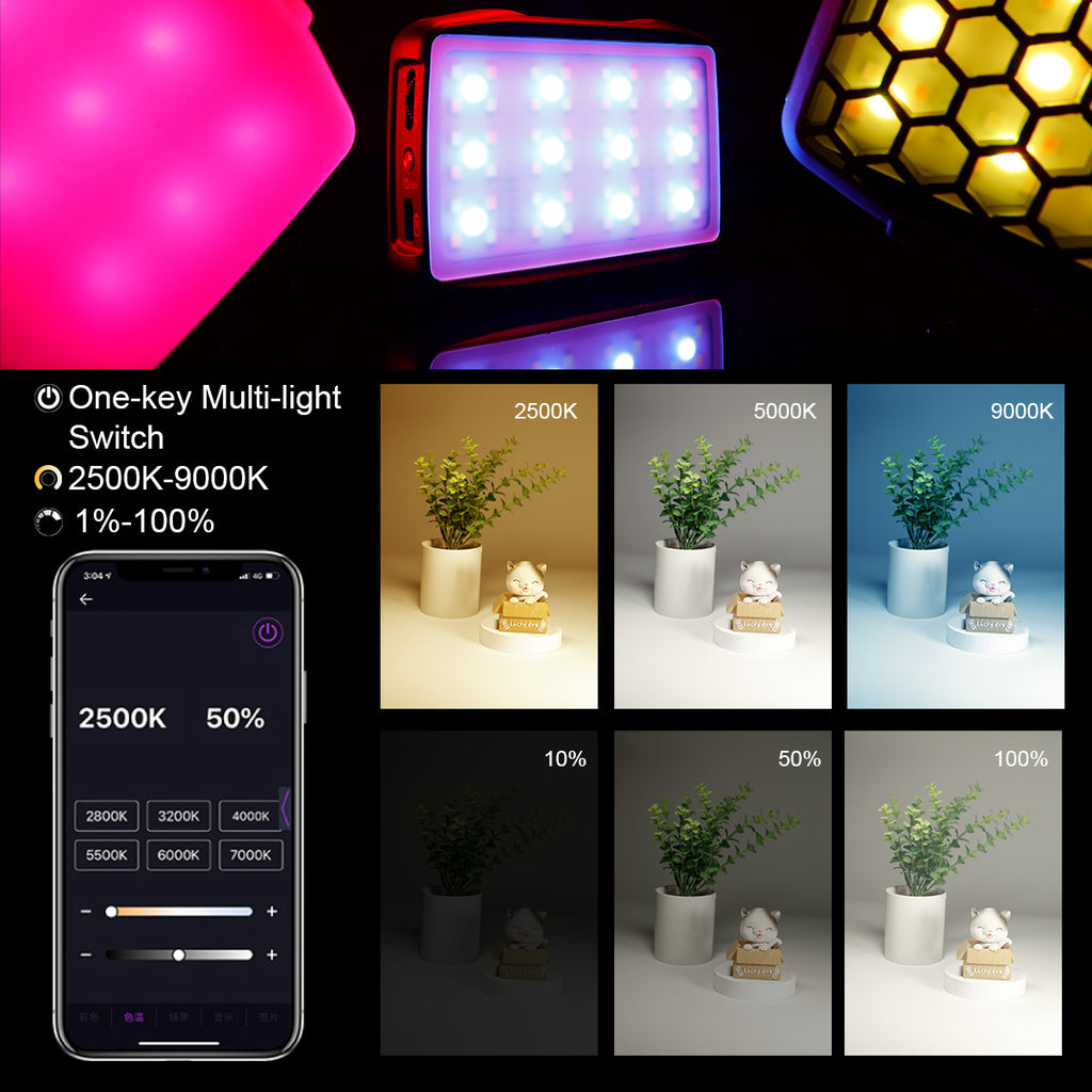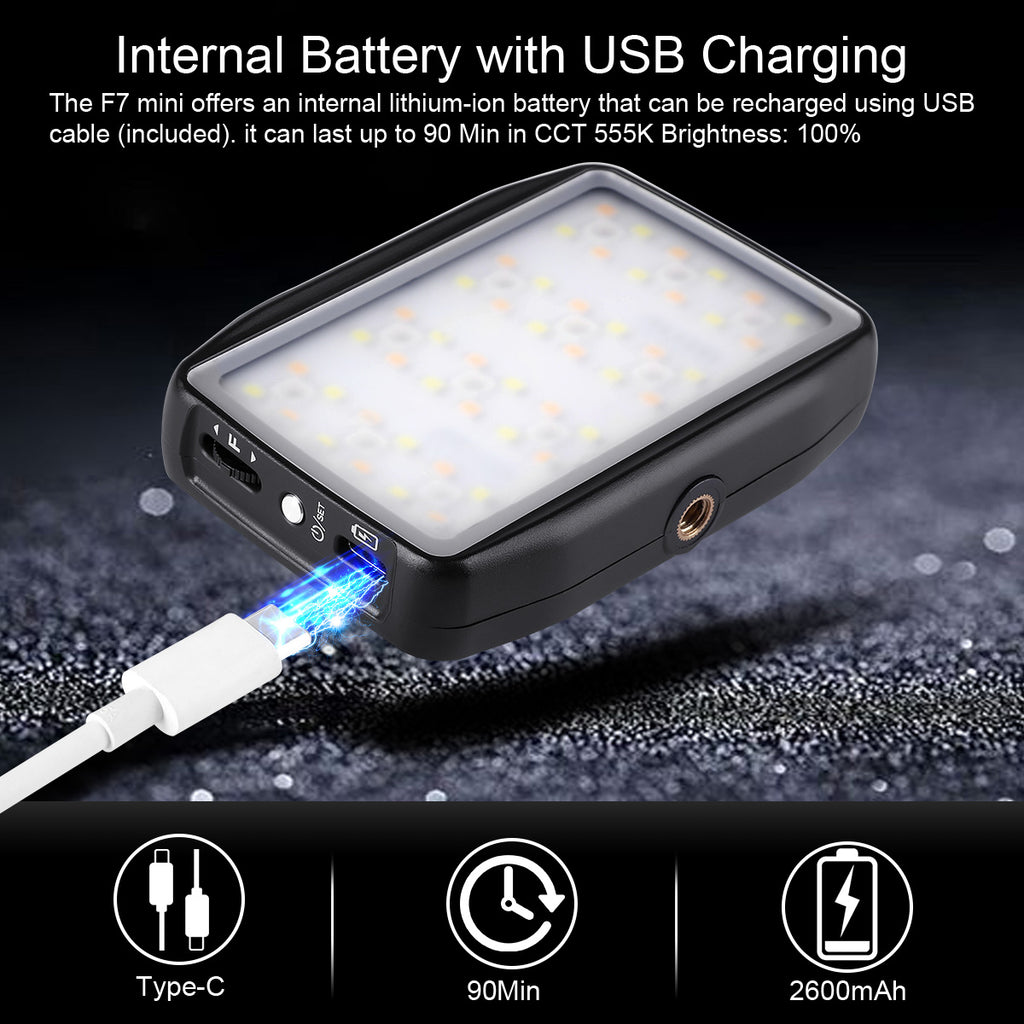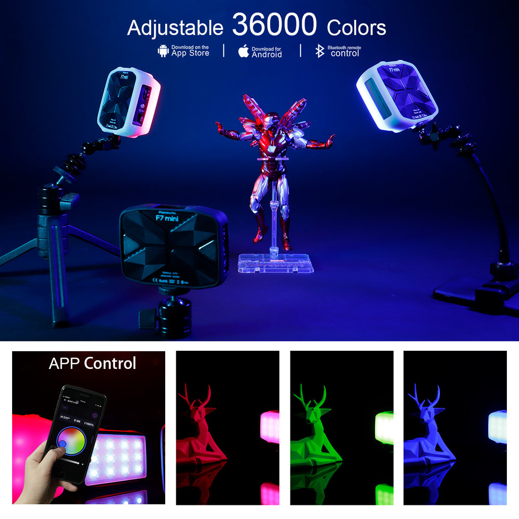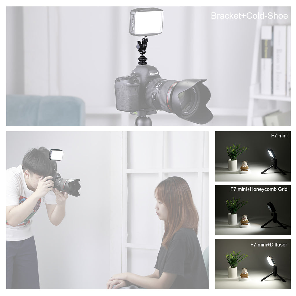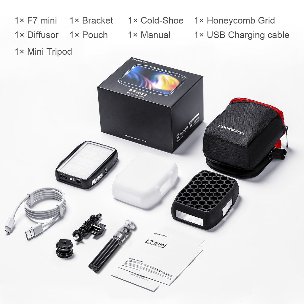 F7 Mini is a 5W power RGB light, built-in 3.7V 2600mAh battery capacity with a maximum power runtime of up to 100 minutes, which is very competitive on the market. As an practical RGB light for filming and photography, it is included with diffusor and grid in the kit!