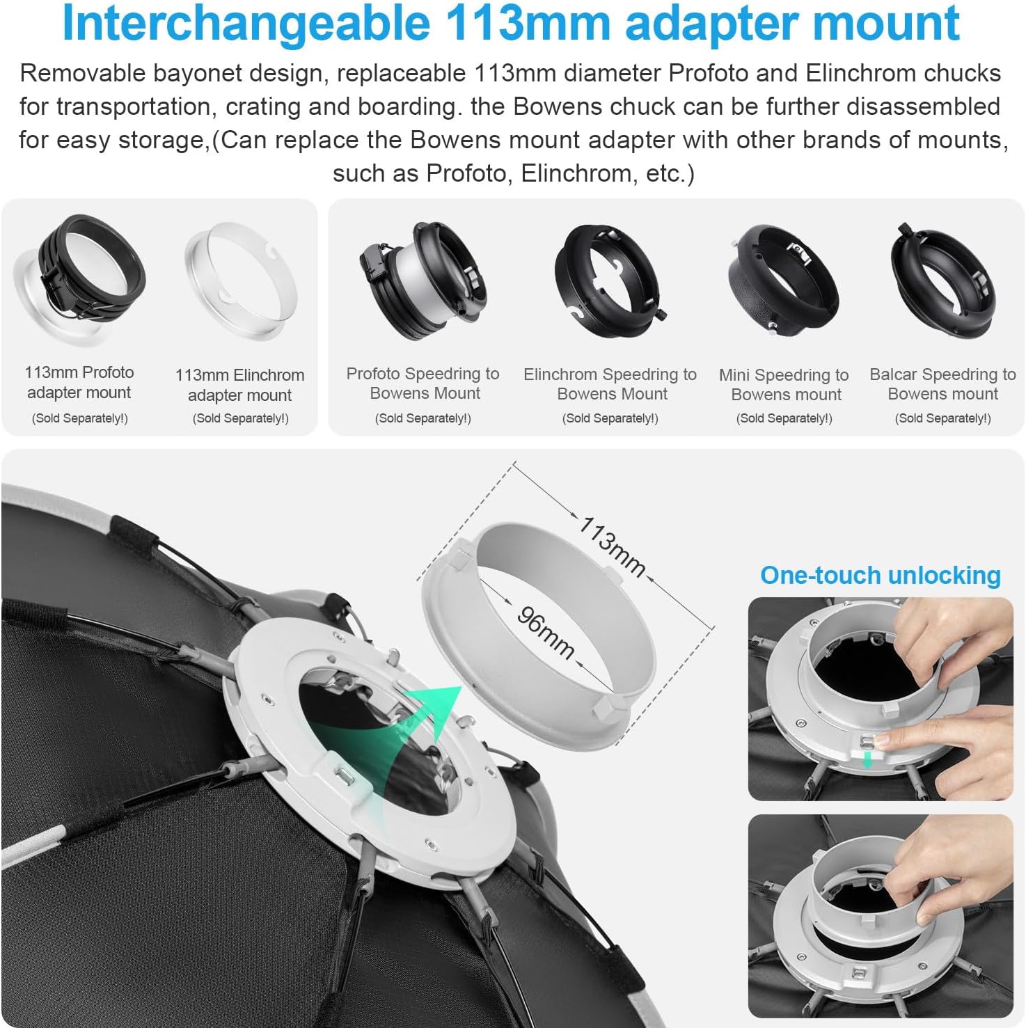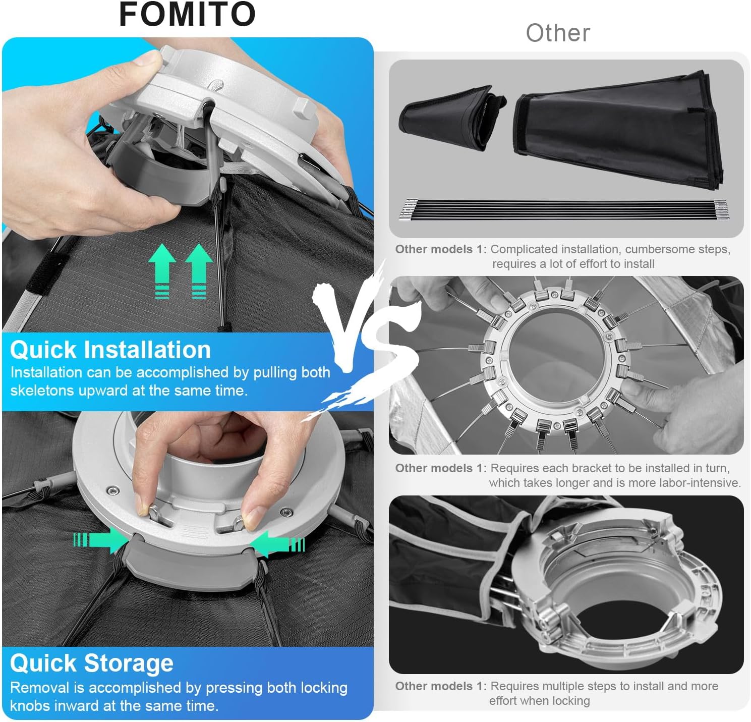 The miniature size is designed with a quick release mount to further enhance the portability of setup and turnaround. Because of its light weight, it can be installed on vertical lighting fixtures without overloading, bringing more angles of soft light to the shooting site.