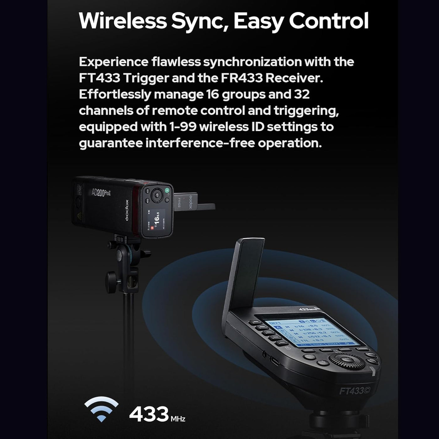 Higher signal demands for control systems, Godox proudlyintroduces FT433 Flash Trigger to elevate your operational efficiencyand precision.Operating on 433MHz frequency band,this trigger provides robust capabilities,with TTL auto flash and High-SpeedSync(up to1/8000s),ensuring flawless performance.